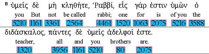 But 1161 be not 3361 ye 5210 called 2564 Rabbi: 4461 for 1063 one 1520 is 2076 your 5216 Master, 2519 even Christ; 5547 and 1161 all 3956 ye 5210 are 2075 brethren. 80 |