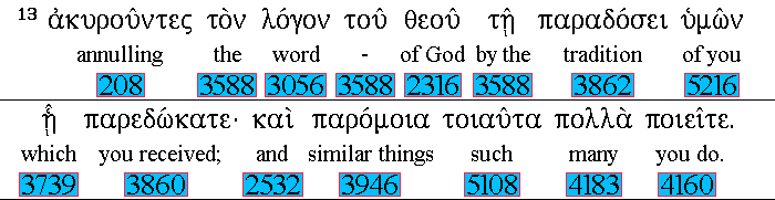 Making the 3588 word 3056 of God 2316 of none effect 208 through your 5216 tradition, 3862 which 3739 ye have delivered: 3860 and 2532 many 4183 such 5108 like things 3946 do ye. 4160 |