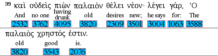 No man 3762 also 2532 having drunk 4095 old 3820 wine straightway 2112 desireth 2309 new: 3501 for 1063 he saith, 3004 The 3588 old 3820 is 2076 better. 5543 |