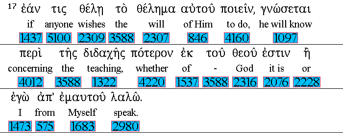 If 1437 any man 5100 will 2309 do 4160 His 846 will, 2307 He shall know 1097 of 4012 the 3588 doctrine, 1322 whether 4220 it be 2076 of 1537 God, 2316 or 2228 whether I 1473 speak 2980 of 575 Myself. 1683 |
