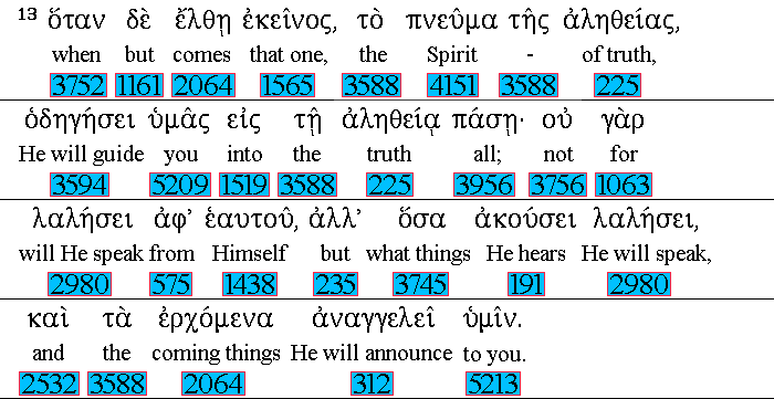 Howbeit 1161 when 3752 He, 1565 the 3588 Spirit 4151 of truth, 225 is come, 2064 He will guide 3594 you 5209 into 1519 all 3956 truth: 225 for 1063 He shall not 3756 speak 2980 of 575 Himself; 1438 but 235 whatsoever 3745 He shall hear, 191 that shall He speak: 2980 and 2532 He will shew 312 you 5213 things to come. 2064 |