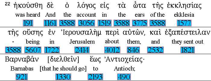 Then 1161 tidings 3056 of these 4012 things 846 came 191 unto 1519 the 3588 ears 3775 of the 3588 ekklesia 1577 which 3588 was in 1722 Jerusalem: 2414 and 2532 they sent forth 1821 Barnabas, 921 that he should go 1330 as far as 2193 Antioch. 490 |