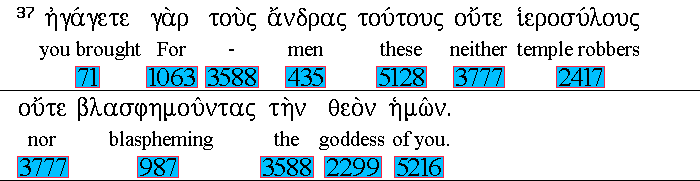 For 1063 ye have brought 71 hither these 5128 men, 435 which are neither 3777 robbers of temples, 2417 nor 3777 yet blasphemers 987 of your 5216 goddess. 2299 |