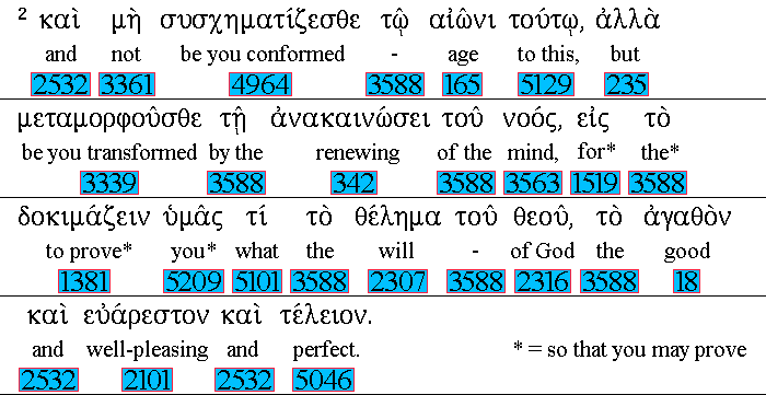 And 2532 be not 3361 conformed 4964 to this 5129 world: 165 but 235 be ye transformed 3339 by the 3588 renewing 342 of your 5216 mind, 3563 that ye 5209 may prove 1381 what 5101 is that good, 18 and 2532 acceptable, 2101 and 2532 perfect, 5046 will 2307 of God. 2316 |