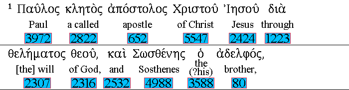 Paul, 3972 called 2822 to be an apostle 652 of Jesus 2424 Christ 5547 through 1223 the will 2307 of God, 2316 and 2532 Sosthenes 4988 our brother, 80 |