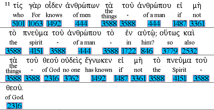 For 1063 what 5101 man 444 knoweth 1492 the things 3588 of a man, 444 save 1508 the 3588 spirit 4151 of man 444 which 3588 is in 1722 him? 846 even 2532 so 3779 the things 3588 of God 2316 knoweth 1492 no man, 3762 but 1508 the 3588 Spirit 4151 of God. 2316 |