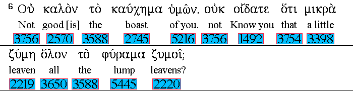 Your 5216 glorying 2745 is not 3756 good. 2570 Know 1492 ye not 3756 that 3754 a little 3398 leaven 2219 leaveneth 2220 the 3588 whole 3650 lump? 5445 |