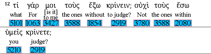 For 1063 what have I 3427 to do 5101 to judge 2919 them also 2532 that are without? 1854 do not 3780 ye 5210 judge 2919 them that are within? 2080 |