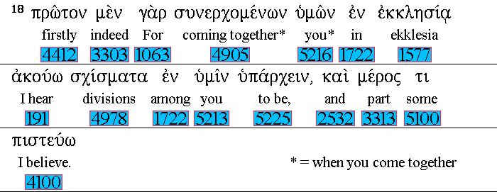 For 1063 first of all, 4412 when 3303 ye 5216 come together 4905 in 1722 the 3588 ekklesia, 1577 I hear 191 that there be 5225 divisions 4978 among 1722 you; 5213 and 2532 I partly 3313 - 5100 believe it. 4100 |