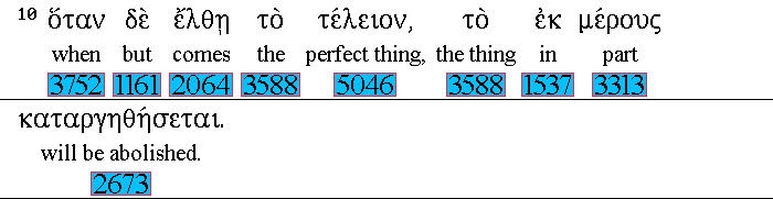 But 1161 when 3752 that which is perfect 5046 is come, 2064 then 5119 that 3588 which is in 1537 part 3313 shall be done away. 2673 |