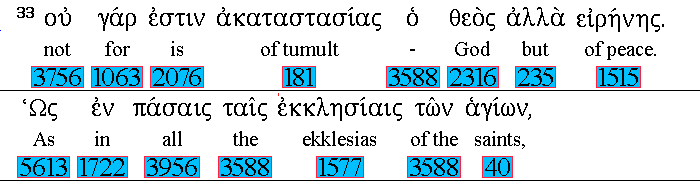 For 1063 God 2316 is 2076 not 3756 the author of confusion, 181 but 235 of peace, 1515 as 5613 in 1722 all 3956 ekklesias 1577 of the 3588 saints. 40 |