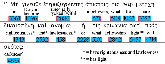 Be 1096 ye not 3361 unequally yoked together 2086 with unbelievers: 571 for 1063 what 5101 fellowship 3352 hath righteousness 1343 with 2532 unrighteousness? 458 and 1161 what 5101 communion 2842 hath light 5457 with 4314 darkness? 4655 |