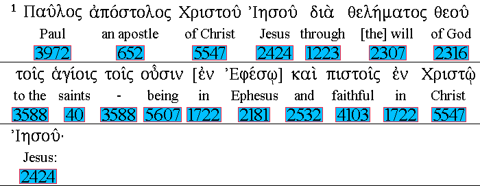Paul, 3972 an apostle 652 of Jesus 2424 Christ 5547 by 1223 the will 2307 of God, 2316 to the 3588 saints 40 which are 5607 at 1722 Ephesus, 2181 and 2532 to the faithful 4103 in 1722 Christ 5547 Jesus: 2424 |