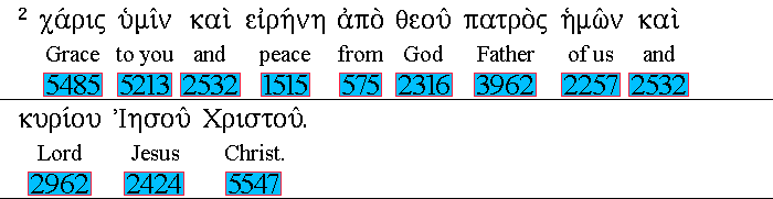 Grace 5485 be to you, 5213 and 2532 peace, 1515 from 575 God 2316 our 2257 Father, 3962 and 2532 from the Lord 2962 Jesus 2424 Christ. 5547 |
