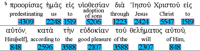 Having predestinated 4309 us 2248 unto 1519 the adoption of children 5206 by 1223 Jesus 2424 Christ 5547 to 1519 Himself, 848 according 2596 to the 3588 good pleasure 2107 of His 848 will, 2307 |