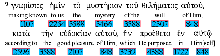 Having made known 1107 unto us 2254 the 3588 mystery 3466 of His 848 will, 2307 according 2596 to His 848 good pleasure 2107 which 3739 He hath purposed 4388 in 1722 Himself: 848 |