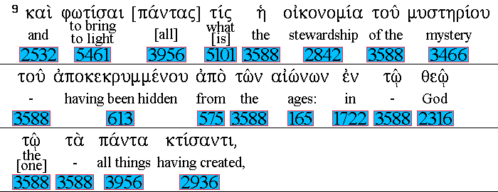 And 2532 to make all men 3956 see 5461 what 5101 is the 3588 fellowship 2842 of the 3588 mystery, 3466 which from 575 the 3588 beginning of the world 165 hath been hid 613 in 1722 God, 2316 who created 2936 all things 3956 by 1223 Jesus 2424 Christ: 5547 |