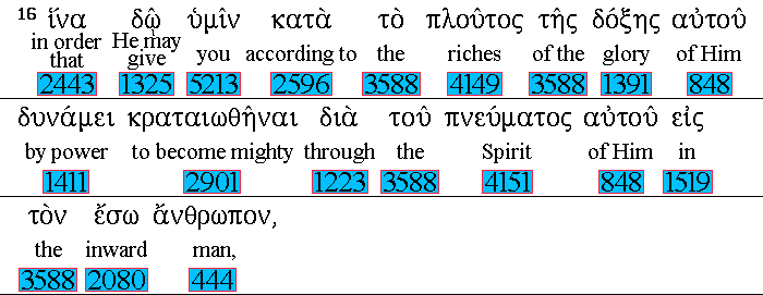 That 2443 He would grant 1325 you, 5213 according 2596 to the 3588 riches 4149 of His 848 glory, 1391 to be strengthened 2901 with might 1411 by 1223 His 848 Spirit 4151 in 1519 the 3588 inner 2080 man; 444 |