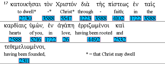 That Christ 5547 may dwell 2730 in 1722 your 5216 hearts 2588 by 1223 faith; 4102 that 2443 ye, being rooted 4492 and 2532 grounded 2311 in 1722 love, 26 |