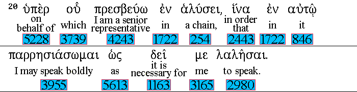 For 5228 which 3739 I am an ambassador 4243 in 1722 bonds: 254 that 2443 there- 846 -in 1722 I may speak boldly, 3955 as 5613 I 3165 ought 1163 to speak. 2980 |