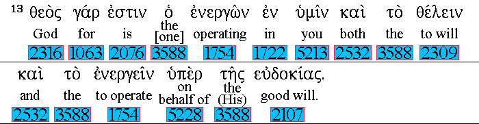 For 1063 it is 2076 God 2316 which worketh 1754 in 1722 you 5213 both 2532 to will 2309 and 2532 to do 1754 of His 5228 good pleasure. 2107 |