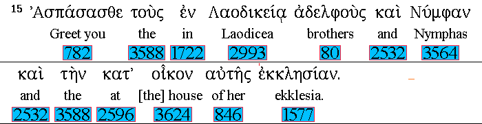 Salute 782 the 3588 brethren 80 which are in 1722 Laodicea, 2993 and 2532 Nymphas, 3564 and 2532 the 3588 ekklesia 1577 which is in 2596 his 846 house. 3624 |