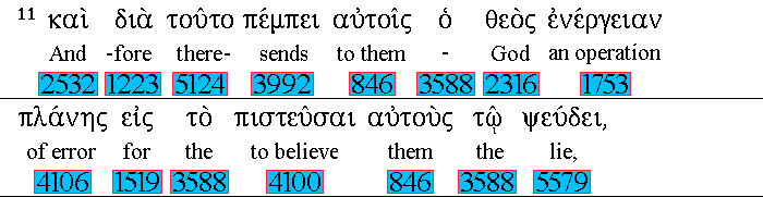 And 2532 for 1223 this cause 5124 God 2316 shall send 3992 them 846 strong 1753 delusion, 4106 that they 846 should 1519 believe 4100 a lie: 5579 |