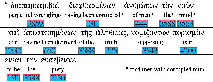 Perverse disputings 3859 of men 444 of corrupt 1311 minds, 3563 and 2532 destitute 650 of the 3588 truth, 225 supposing 3543 that gain 4200 is 1511 godliness: 2150 from 575 such 5108 withdraw thyself. 868 |