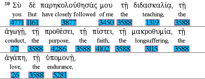 But 1161 thou 4771 hast fully known 3877 my 3450 doctrine, 1319 manner of life, 72 purpose, 4286 faith, 4102 longsuffering, 3115 charity, 26 patience, 5281 |