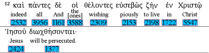 Yea, 1161 and 2532 all 3956 that will 2309 live 2198 godly 2153 in 1722 Christ 5547 Jesus 2424 shall suffer persecution. 1377 |