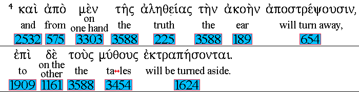 And 2532 they shall turn away 654 their ears 189 from 575 [on one hand] 3303 the 3588 truth, 225 and 1161 shall be turned 1624 unto 1909 fables. 3454 |