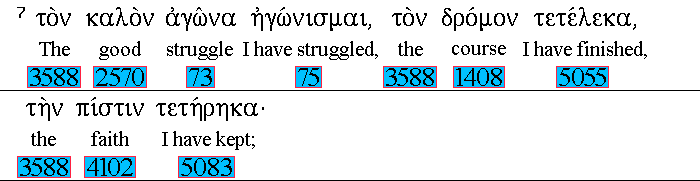 I have fought 75 a good 2570 fight, 73 I have finished 5055 my course, 1408 I have kept 5083 the 3588 faith: 4102 |