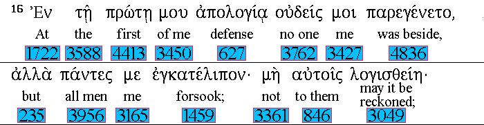 At 1722 my 3450 first 4413 answer 627 no man 3762 stood with 4836 me, 3427 but 235 all 3956 men forsook 1459 me: 3165 I pray God that it may not 3361 be laid to their 846 charge. 3049 |