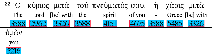 The 3588 Lord 2962 Jesus 2424 Christ 5547 be with 3326 thy 4675 spirit. 4151 Grace 5485 be with 3326 you. 5216 Amen. 281 |