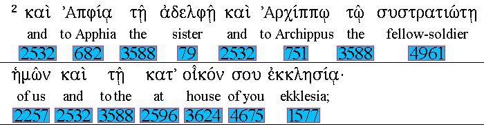 And 2532 to our beloved 27 Apphia, 682 and 2532 Archippus 751 our 2257 fellowsoldier, 4961 and 2532 to the 3588 ekklesia 1577 in 2596 thy 4675 house: 3624 |