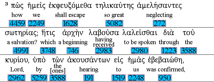 How 4459 shall we 2249 escape, 1628 if we neglect 272 so great 5082 salvation; 4991 which 3748 at the first 746 began 2983 to be spoken 2980 by 1223 the 3588 Lord, 2962 and 2532 was confirmed 950 unto 1519 us 2248 by 5259 them that heard Him; 191 |