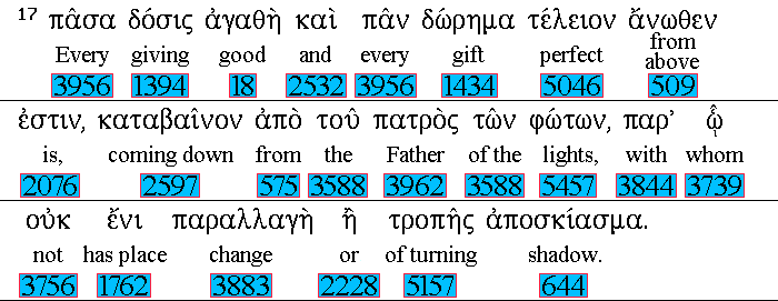 Every 3956 good 18 gift 1394 and 2532 every 3956 perfect 5046 gift 1434 is 2076 from above, 509 and cometh down 2597 from 575 the 3588 Father 3962 of lights, 5457 with 3844 whom 3739 is 1762 no 3756 variableness, 3883 neither 2228 shadow 644 of turning. 5157 |