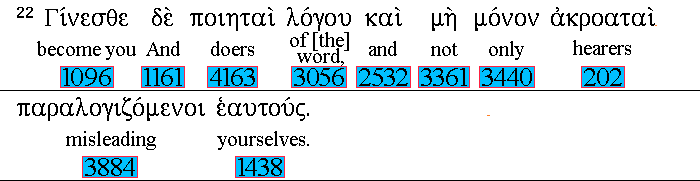 But 1161 be 1096 ye doers 4163 of the word, 3056 and 2532 not 3361 hearers 202 only, 3440 deceiving 3884 your own selves. 1438 |