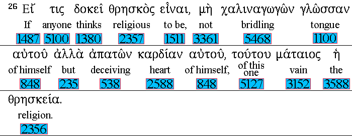 If any man 1536 among 1722 you 5213 seem 1380 to be 1511 religious, 2357 and bridleth 5468 not 3361 his 848 tongue, 1100 but 235 deceiveth 538 his own 848 heart, 2588 this man's 5127 religion 2356 is vain. 3152 |