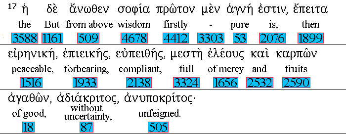 But 1161 the 3588 wisdom 4678 that is from above 509 is 2076 first 4412 - 3303 pure, 53 then 1899 peaceable, 1516 gentle, 1933 and easy to be intreated, 2138 full 3324 of mercy 1656 and 2532 good 18 fruits, 2590 without partiality, 87 and 2532 without hypocrisy. 505 |