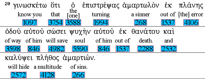 Let him know, 1097 that 3754 he which converteth 1994 the sinner 268 from 1537 the error 4106 of his 846 way 3598 shall save 4982 a soul 5590 from 1537 death, 2288 and 2532 shall hide 2572 a multitude 4128 of sins. 266 |