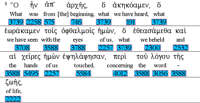 That which 3739 was 2258 from 575 the beginning, 746 which 3739 we have heard, 191 which 3739 we have seen 3708 with our 2257 eyes, 3788 which 3739 we have looked upon, 2300 and 2532 our 2257 hands 5495 have handled, 5584 of 4012 the 3588 Word 3056 of life; 2222 |
