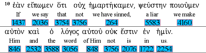 If 1437 we say 2036 that 3754 we have not 3756 sinned, 264 we make 4160 Him 846 a liar, 5583 and 2532 His 848 word 3056 is 2076 not 3756 in 1722 us. 2254 |