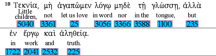 My 3450 little children, 5040 let us not 3361 love 25 in word, 3056 neither 3366 in tongue; 1100 but 235 in deed 2041 and 2532 in truth. 225 |